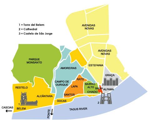 In tutta Lisbona ci sono 53 freguesias (quartieri sotto amministrazione diversa), raggruppati in quattro bairros. Non vi serve conoscerli tutti, quelli dove si concentrano le attrazioni turistiche e i centri storici sono raffigurati nella mappa sottostante, che risultano anche come zone ideali dove alloggiare.